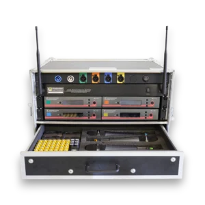 Das gesamte Set ist in einem robusten Rack-Gehäuse untergebracht, das eine integrierte Schublade zur Aufbewahrung der Mikrofone und Batterien enthält. Die Verkabelung ist professionell vorbereitet, mit PowerCON In- und Out-Anschlüssen für eine zuverlässige Stromversorgung. Dank der externen Antennen und hochwertigen Empfänger bietet dieses Set eine stabile und störungsfreie Funkverbindung mit einer großen Reichweite.